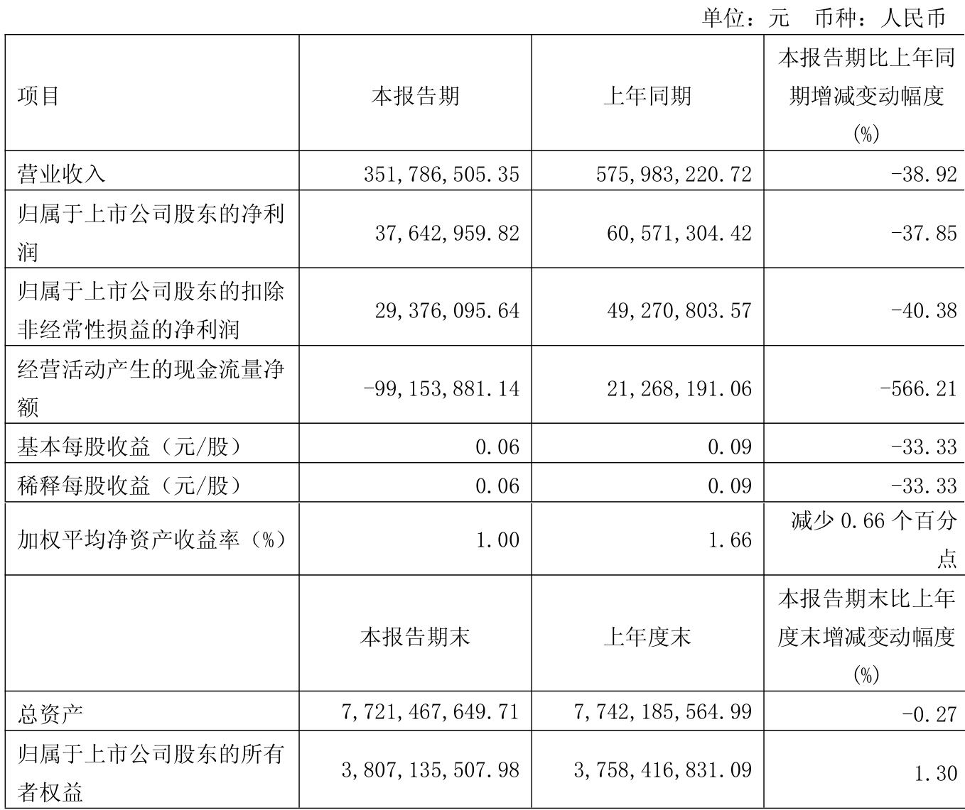 中证智能财讯创力集团(603012)4月26日披露2025年第一季度报告。公司实现营业总收入3.52亿元,同比下降38.92%;归母净利润3764.3万元,同比下降37.85%;扣非净利润2937.61万元,同比下降40.38%;经营活动产生的现金流量净额为-9915.39万元,上年同期为2126.82万元;报告期内,创力集团基本每股收益为0.06元,加权平均净资产收益率为1.00%。